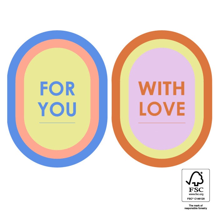 Deze ovale stickers met de teksten “For You” en “With Love” zijn perfect voor persoonlijke cadeaus. Duurzaam en FSC®-gecertificeerd.