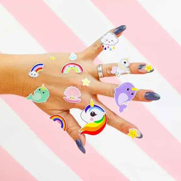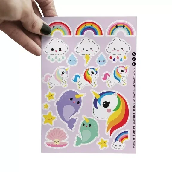 Stickervel Eenhoorn narwal regenboog zijn geschikt voor iedereen die van kawaii houdt. De leukste stickers met kawaii figuurtjes om je cadeaus mee te versieren vind je dan ook bij Studio Inktvis! Want wie houdt er nu niet van een panda en eenhoorns. Ook leuk voor agenda, planner, telefoon of als beloningssticker.