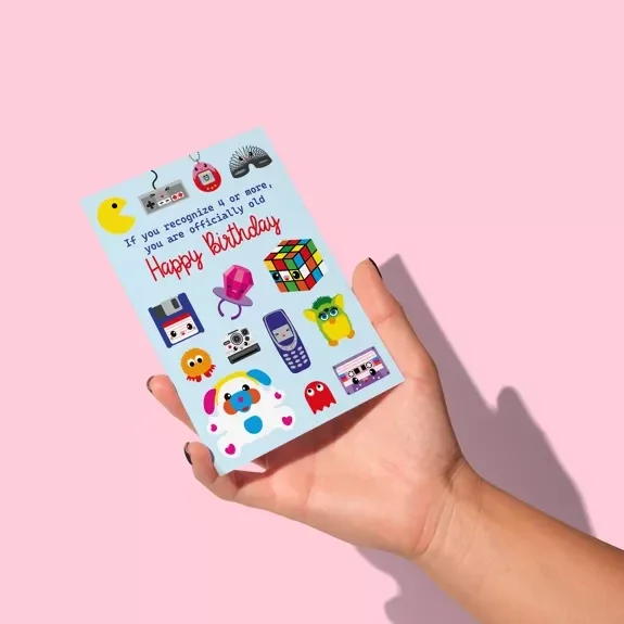 Herleef de magische jaren '80 en '90 met onze hilarische verjaardagskaart! Deze unieke kaart brengt je terug naar de tijd van Game Boys, Nokia telefoons, Care Bears, cassettebandjes, VHS-tapes, wuppies, Furby's, diskettes en Rubik's Cubes. Perfect voor iedereen die nostalgische herinneringen koestert aan deze iconische decennia en houdt van een goede lach.