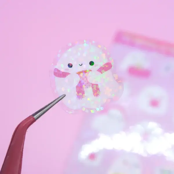 Een A6 stickervel met daarop meerdere kleine stickers. Leuk voor het versieren van je post, journal of cadeaus. De stickers zijn gedrukt op transparant waterproof pvc en daardoor zijn de spookjes semi-transparant, net zoals echte spoken! Maar ze zijn ook te gebruiken op een witte achtergrond doordat er een roze rand om de spookjes heen zit. En om ze net even wat magischer te maken, hebben ze een sparkly holografische laag.