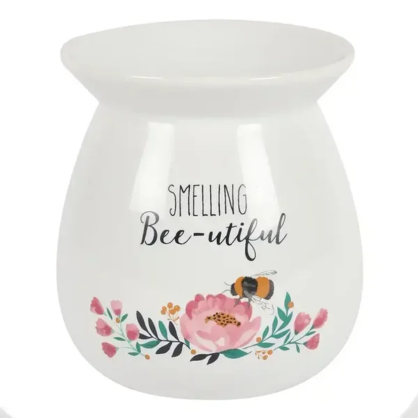 Dit item is een prachtige cadeauset om het huis mee te parfumeren en bevat een grote witte keramische oliebrander met een bloemig 'Smelling Bee-utiful'-ontwerp en een blikje sojasmelts met Honey and Heather.