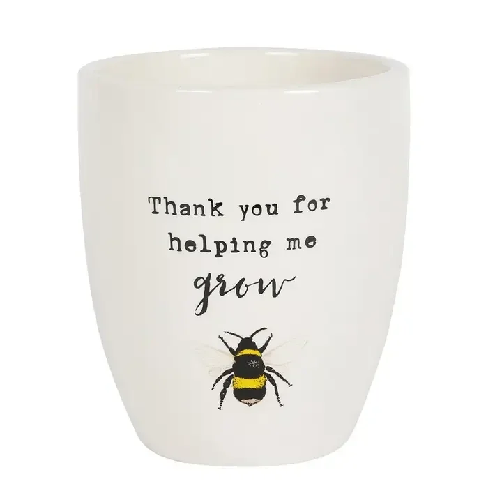 Deze keramische plantenpot zal zeker een glimlach op iemands gezicht toveren met zijn schattige bijenillustratie en zoete 'Bedankt voor het helpen groeien 'tekst. Maakt een leuk lerarencadeau of een doordachte pick-me-up voor een speciaal iemand. Ontworpen door Something Different Wholesale.