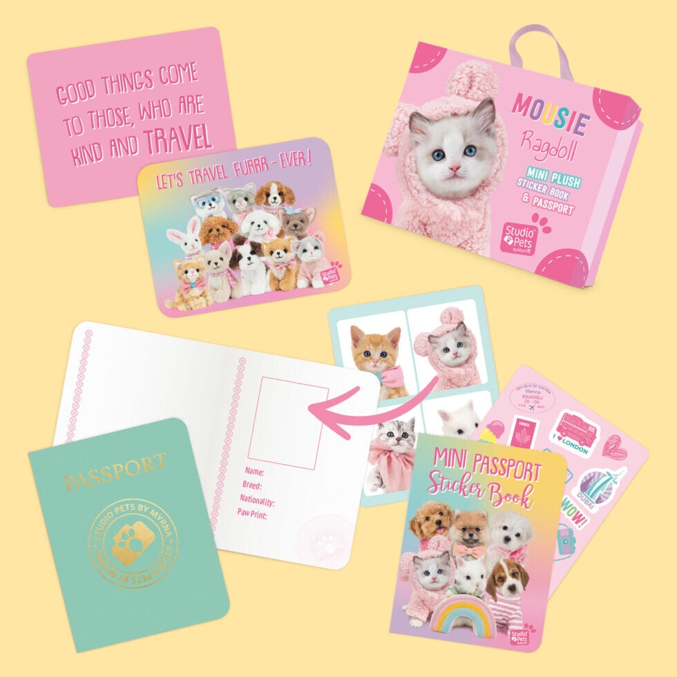 Dit koffertje bevat een paspoortje en een stickerboekje met maar liefst 66 stickertjes, zodat je het paspoortje van pluche poes Mousie helemaal naar wens kunt personaliseren.