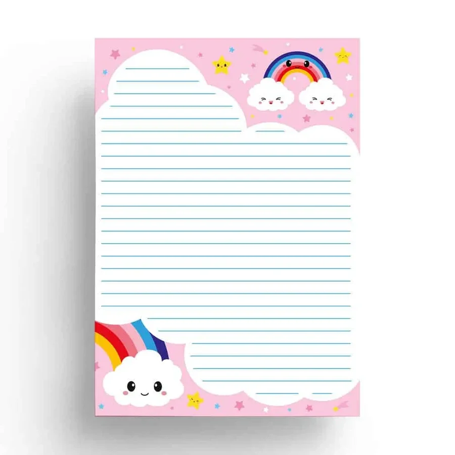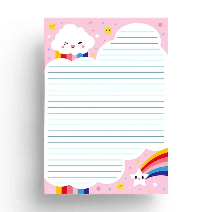 Het Notitieblok briefpapier A5 Wolk regenboog is dus niet alleen enorm geschikt als briefpapier, maar ook ideaal voor notities. Notitieblok Wolk regenboog van Studio Inktvis is een blok bestaande uit 50 pagina’s van 80 grams papier. Het blok is gedrukt op A5 formaat (14,8 x 21 cm) in de kleuren roze, wit en blauw. Het ontwerp bestaat uit illustraties van wolken, regenbogen en sterretjes met al dan niet een kawaii gezichtje. Het middenvlak is lichter zodat elke brief of notitie even duidelijk blijft. Het blok is dubbelzijdig bedrukt en gelinieerd.