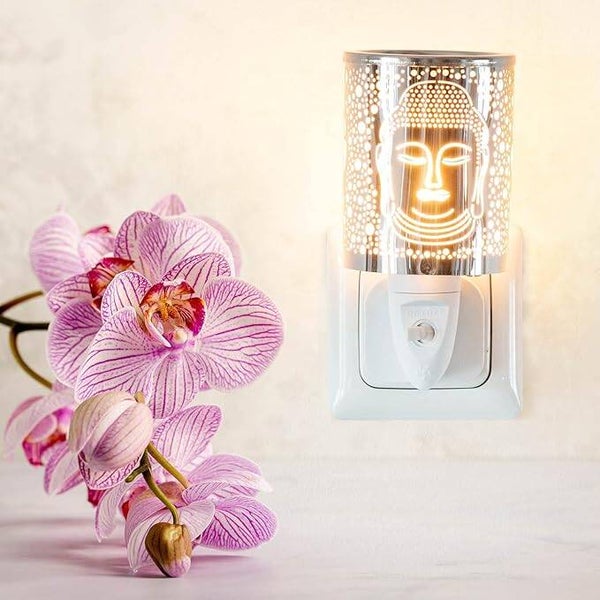 - Elektrische waxbrander met een Indiaas motief in zilver. Deze brander kan ook gebruikt worden als charmant bedlampje.